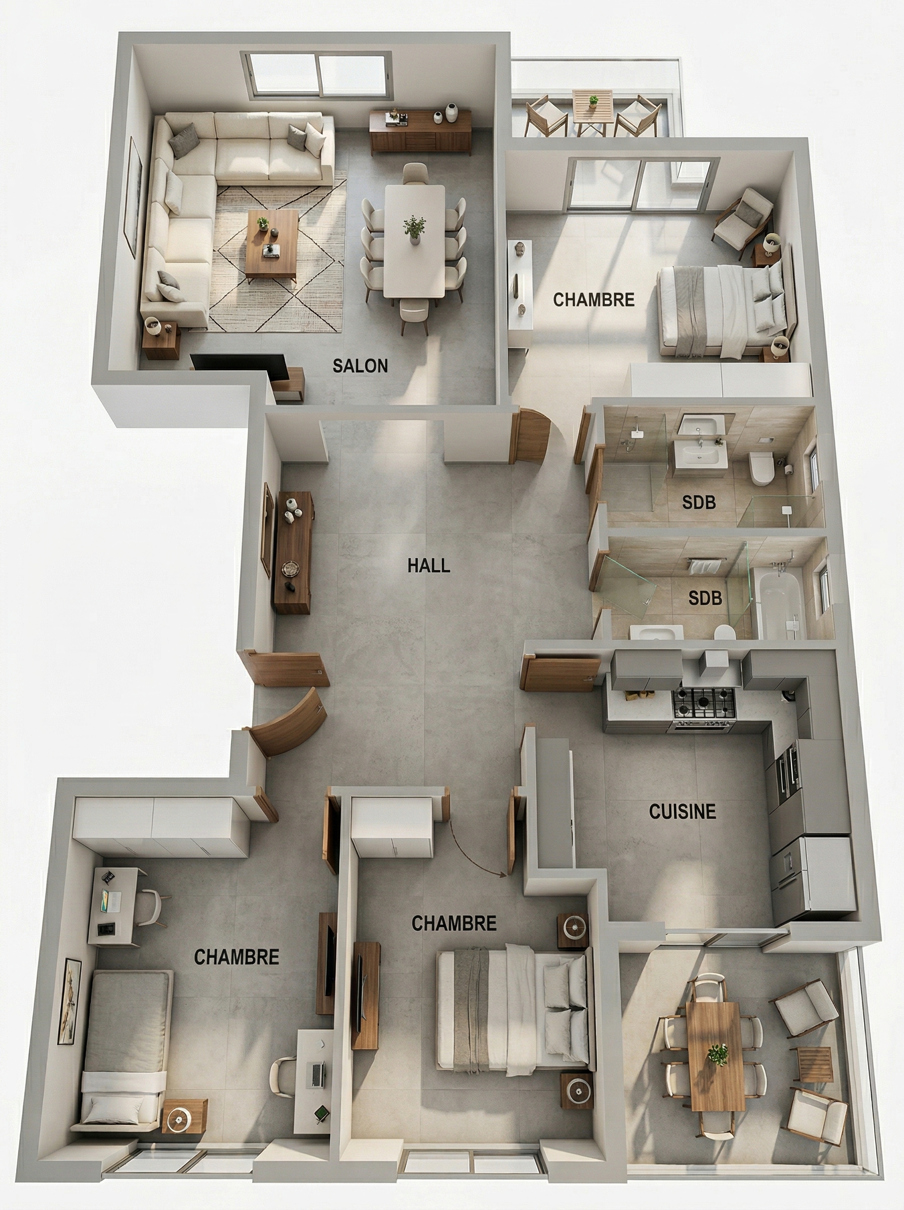 les appartements ont 2 façades ensoleillés NORD et SUD. Chaque appartement se compose de :